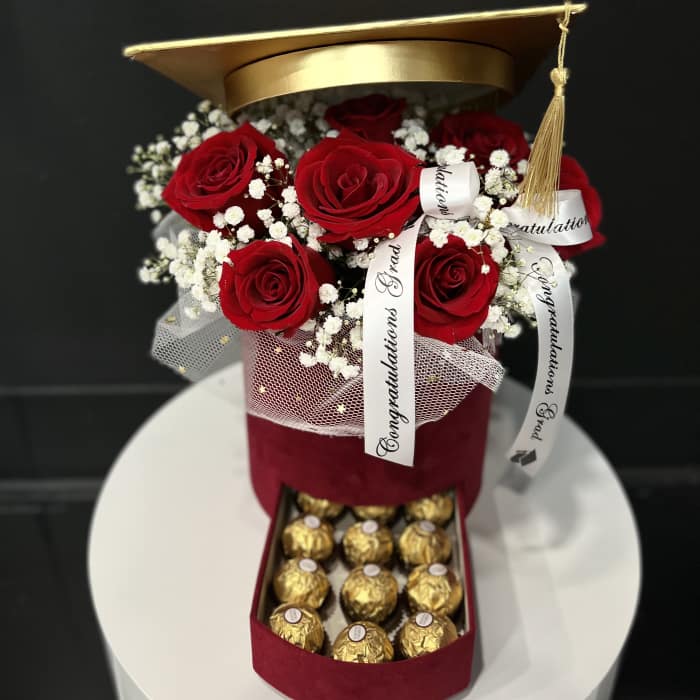 Price: $117.00Graduation flowers in the box with 12 chocolates!